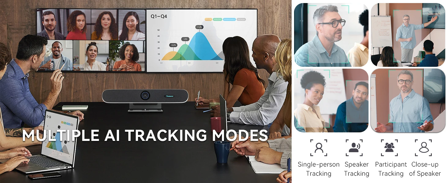 AI Modes: Single person tracking, speaker tracking, participant tracking, close-up of speaker