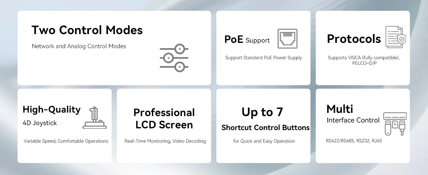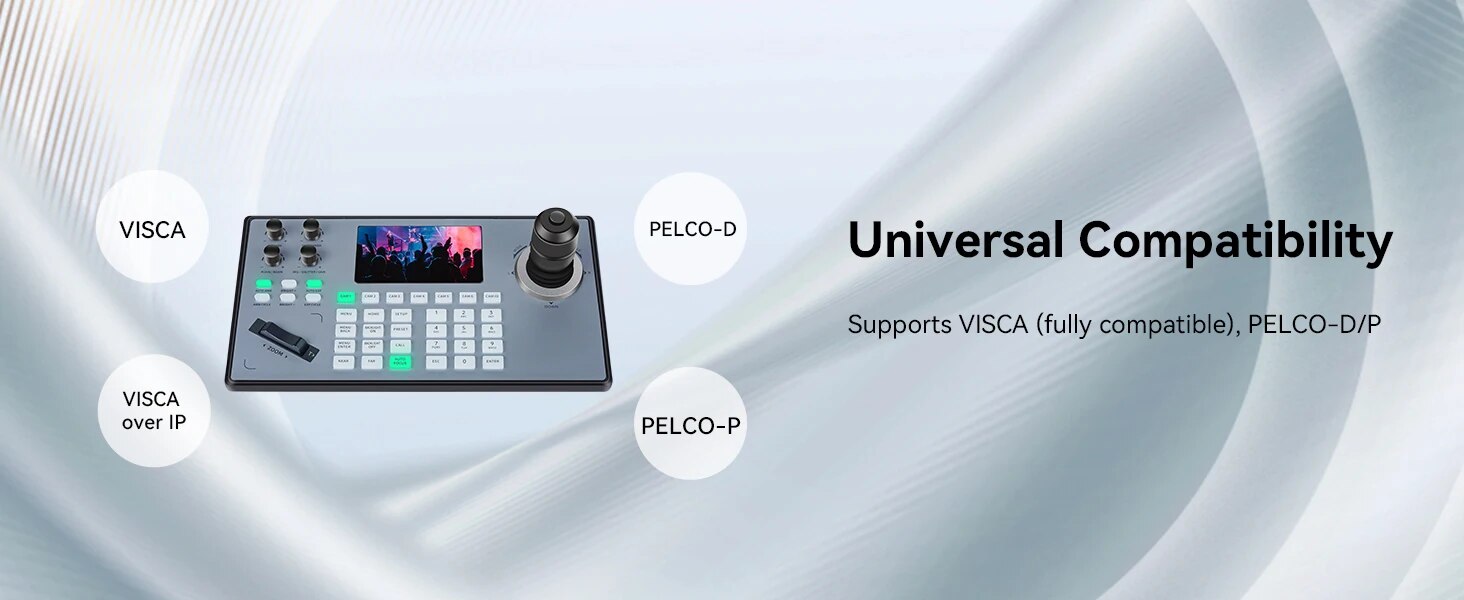 🌟【𝐔𝐧𝐦𝐚𝐭𝐜𝐡𝐞𝐝 𝐂𝐨𝐦𝐩𝐚𝐭𝐢𝐛𝐢𝐥𝐢𝐭𝐲】The PTZ Controller support network and analog two control modes. With support for a wide array of protocols including Visca UDP, Visca TCP, Sony Visca, Pelco-D/P, NDI(Partially compatible), this joystick controller seamlessly integrates with a variety of cameras and equipment, making it suitable for Large Conferences, church events, live streaming, OBS, vMix, Skype, Zoom, Teams, Fackbook, Youtube and much more.