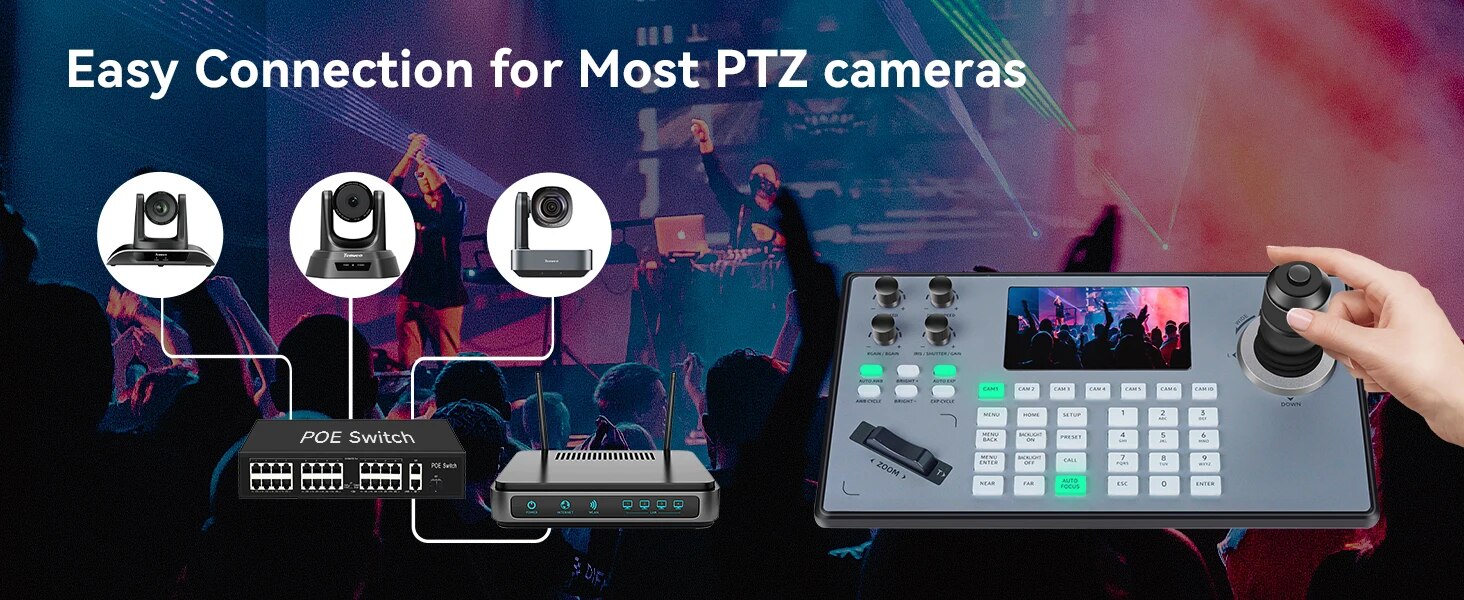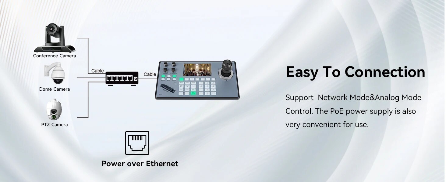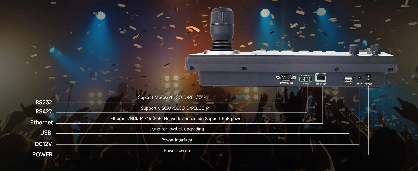 🌟【𝐌𝐮𝐥𝐭𝐢𝐩𝐥𝐞 𝐂𝐨𝐧𝐧𝐞𝐜𝐭𝐢𝐨𝐧𝐬】The upgraded KB200PRO PTZ Camera Joystick Controller offers multiple Connections, including RS422/RS485, RS232, and RJ45(Ethernet). And PoE supported, just one cable to connect to your LAN.The easy-to-use conference control keyboard makes setup a breeze, allowing you to quickly and easily configure your camera settings. This feature is especially useful for those who are new to live streaming or video conferencing.