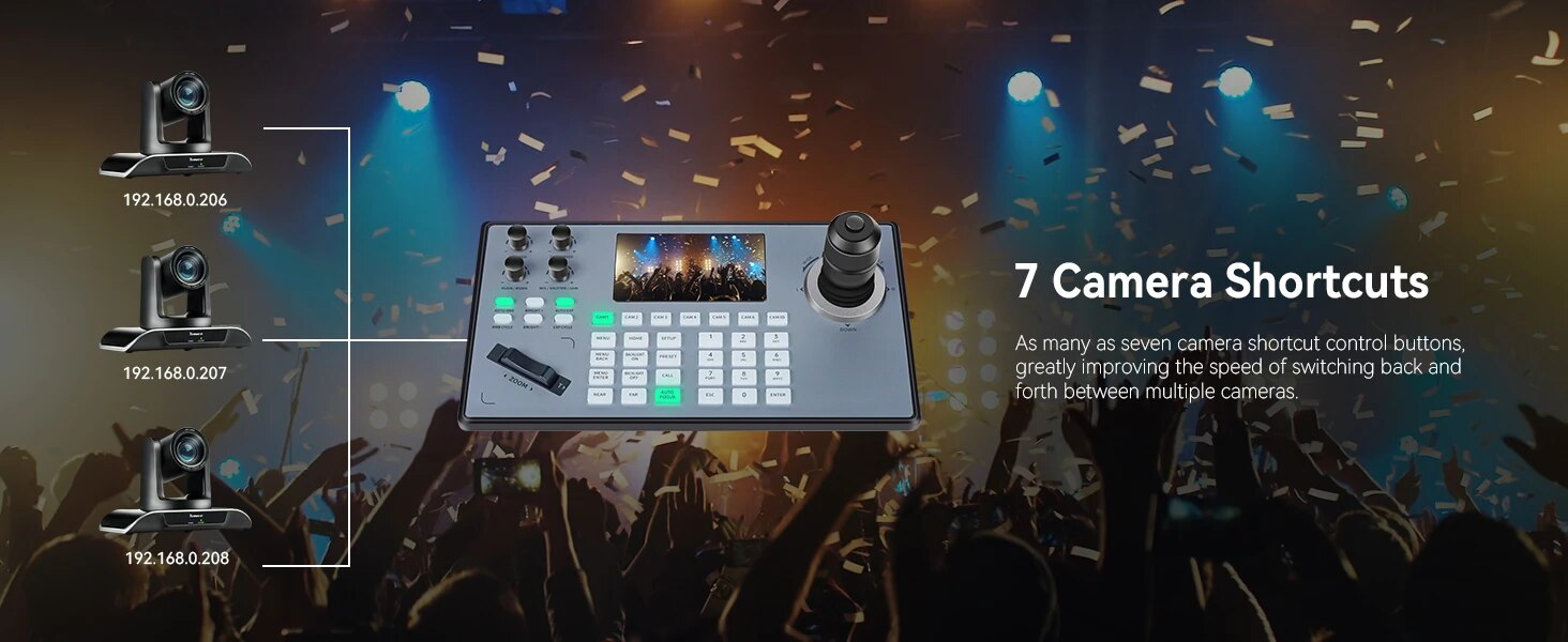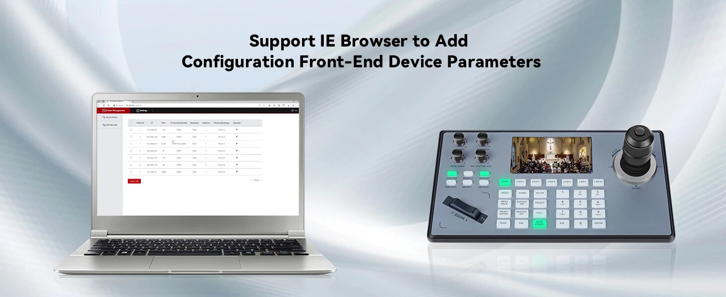 🌟【𝐄𝐚𝐬𝐲 𝐏𝐓𝐙 𝐂𝐨𝐧𝐭𝐫𝐨𝐥】Tenveo KB200PRO PTZ Joystick Controller supports IE browser to add configuration front-end device parameters, and supports 7 cameras quick select, controling up to 255 PTZ cameras, easy and fast operation of the conference video camera, greatly improving the speed of multiple cameras to switch back and forth control. These features make it easy to achieve the exact shot you want, without any hassle.